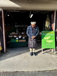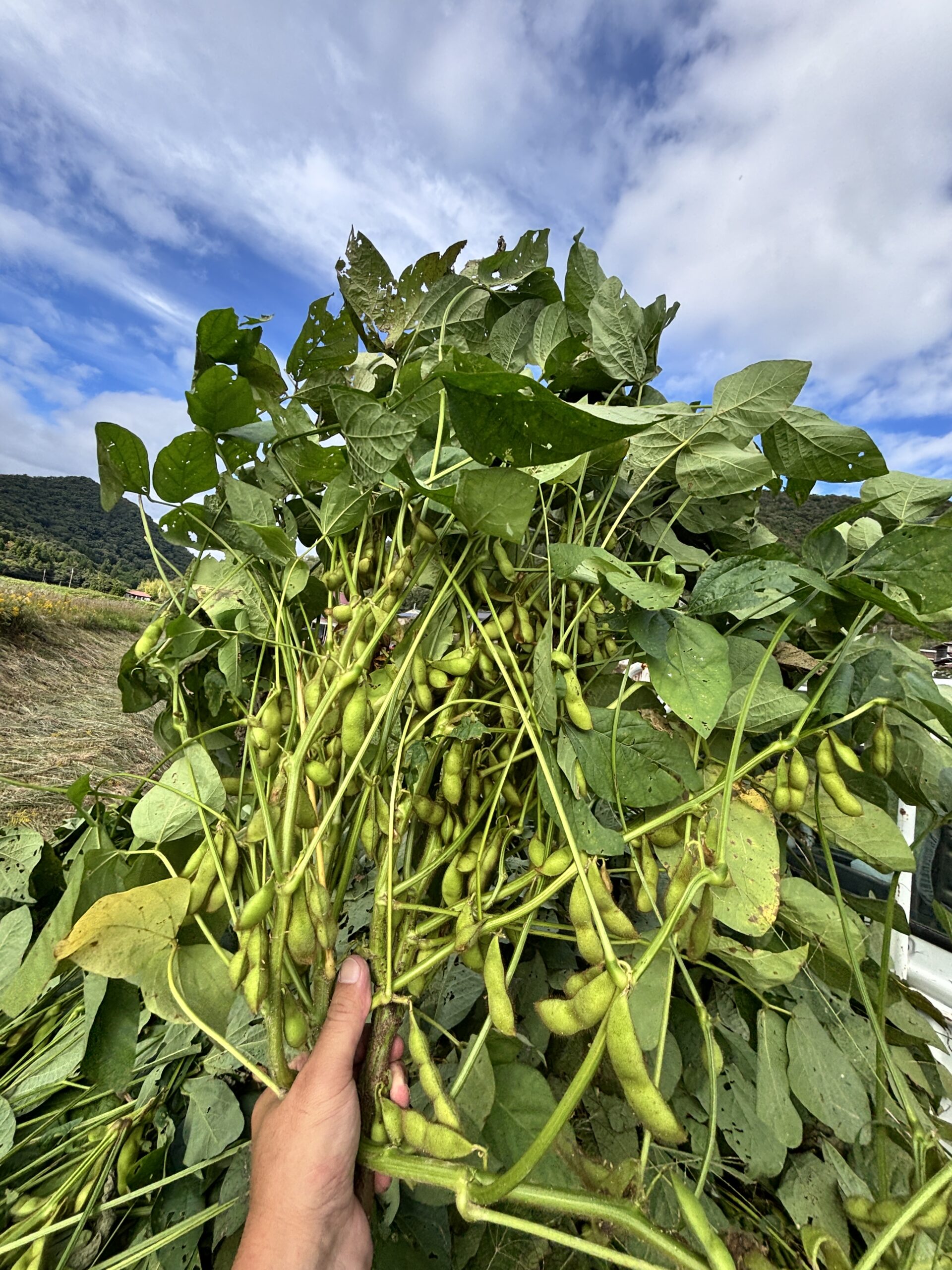当農場作業場にて店頭販売を行っております。500g入り莢枝豆1200円、訳あり1kg1000円、他野菜、卵など販売中です。国道372号線今田町辰巳付近にて当農場看板、のぼりを立てておりますので目印にされてください。なお交通量が比較的多い時期です、当農場への脇道侵入時は早めのウインカー、減速で後続車や対向車との接触にご注意くださいませ。